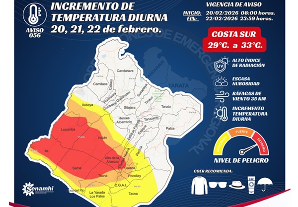 LocalesTACNA: CALOR EXTREMO EN LA CIUDAD Y FUERTES PRECIPITACIONES EN LA SIERRA...Roice Zeballosfebrero 20, 2026 by Roice Zeballosfebrero 20, 202603 Nuestra región atraviesa un escenario climático de contrastes. Mientras la zona urbana de Tacna soportará...