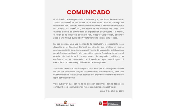 NacionalesMINISTERIO DE ENERGÍA Y MINAS HARÁ NUEVA EVALUACIÓN TÉCNICA SOBRE PROYECTO TÍA...Roice Zeballosabril 11, 2026 by Roice Zeballosabril 11, 202602 El Ministerio de Energía y Minas (Minem) informó que se realizará una nueva evaluación técnica...