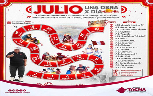 En el mes de Fiestas Patrias, el Gobierno Regional de Tacna (GRT) realizará la entrega e inauguración de 20 obras y/o mantenimientos a favor de la educación, salud y transitabilidad, con un presupuesto de más de S/ 50 millones.