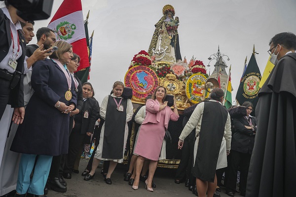 Boluarte -vestida de impecable traje rosado- entregó una ofrenda floral al anda de Santa Rosa y posteriormente se animó a cargar la imagen durante unos minutos. Tras las fotos de rigor y las sonrisas del caso dio por concluida su participación.