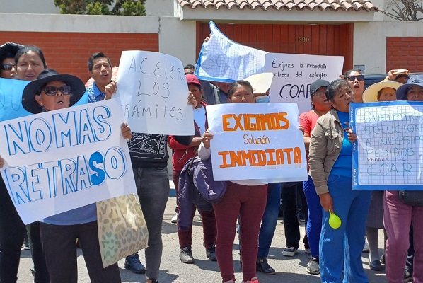 Ya estamos en octubre, y han tenido que ser los padres de familia, desde hace 3 semanas, quienes se han puesto de pie para hacer los reclamos ante las instancias correspondiente, hasta con plantones, movilizaciones y portando cartelones en la prefectura, gobierno regional y la Dirección regional de Educación, solicitando a las autoridades, su inmediato apoyo para interponer sus oficios ante el ministerio de Educación y se proceda con la inmediata inauguración. Todo depende de Lima, que por esa bendita burocracia están perjudicando a los jóvenes estudiantes.