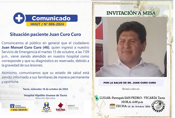 El tío del abogado, Jorge Curo Chata a través de las redes sociales pidió a la población sus oraciones y participación en la misa por la salud de Juan Curo: «… él a sufrido un atentado criminal con arma de fuego y está en estado crítico, pronóstico reservado, posterior a ello realizaremos una vigilia en el frontis del Hospital Unanue (emergencia). .. gracias», escribió.