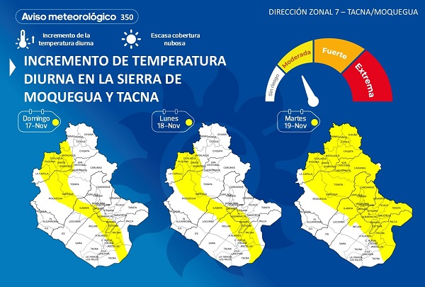 En La Yarada Los Palos la temperatura máxima será de 23 grados, en Pachía de 26 grados, en Palca de 20 grados y en Sama de 29 grados.