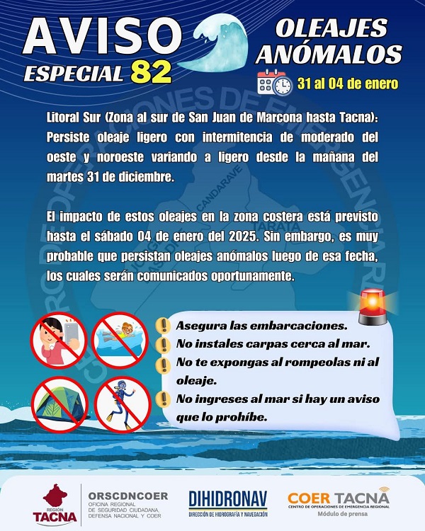 El impacto de estos oleajes en la zona costera está previsto hasta el sábado 04 de enero del 2025. Sin embargo, es muy probable que persistan oleajes anómalos luego de esa fecha, los cuales serán comunicados oportunamente.