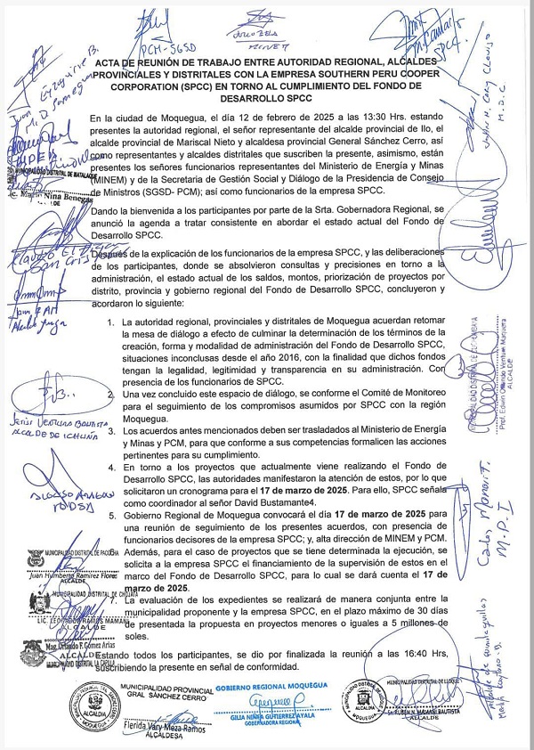 La empresa minera se comprometió a informar antes del 21 de febrero sobre la redefinición de proyectos y formalizar las adendas a convenios hasta el 28 de febrero. Asimismo, el 15 de abril se anunciarán los consultores responsables de cada expediente técnico, en tanto el 24 de febrero explicarán sobre el funcionamiento del Fondo de Desarrollo de Moquegua y los aportes directos que realiza la empresa.