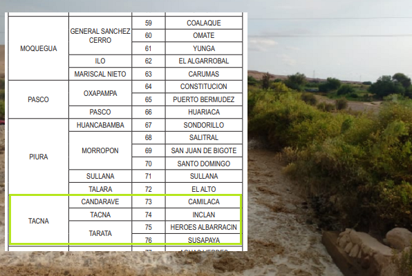 En el diario El Peruano se público que el Estado de Emergencia en lo que corresponde al departamento de Tacna es para los distritos de Camilaca, Inclan, Heroes Albarracín y Susapaya.