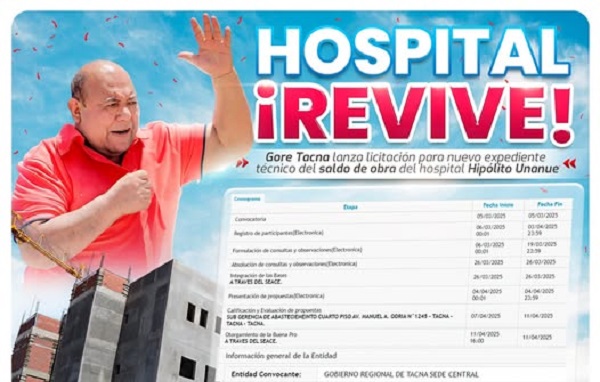 El proceso es convocado por el Gobierno Regional de Tacna y según los términos de referencia (TDR), la contratista que adjudique la licitación tendrá un plazo de 360 días calendarios con un valor referencial de 12 millones 463 mil 632 soles para la elaboración del nuevo expediente técnico de la obra denominada “Mejoramiento de los servicios de salud del hospital Hipólito Unanue de Tacna”.