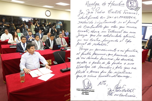 «Pongo en conocimiento a mi familia, al pueblo peruano, que haciendo uso de mi derecho humano, he decidido acatar a partir de la fecha una huelga de hambre», dice Castillo, al tiempo de insistir que está sufriendo una injusticia.
