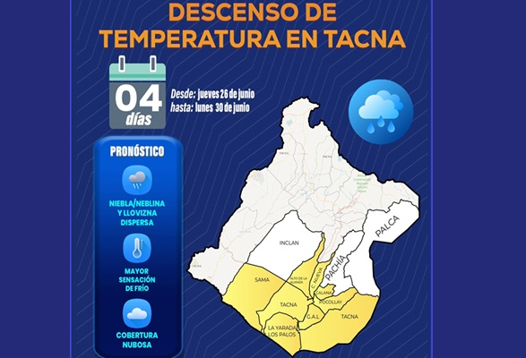 Con información del Senamhi, la Municipalidad de Tacna comunica que se ha previsto el descenso de la temperatura diurna en la costa de Tacna, fenómeno que estará acompañado de niebla, neblina y lloviznas.