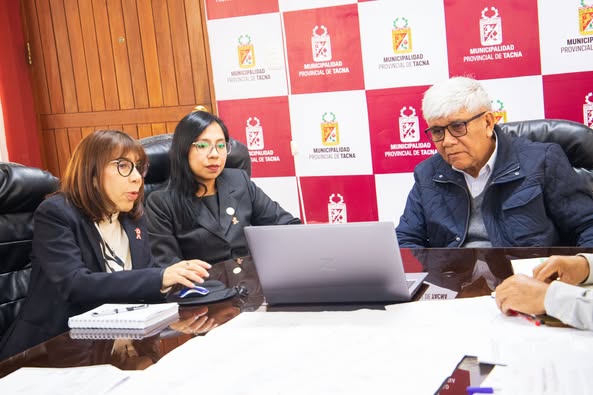 Una importante reunión de trabajo que contó con la participación del alcalde de Tacna Pascual Güisa Bravo y la Dra. Alejandra Huamán Hidalgo, Gerenta Regional de Control de Tacna, desarrollada en la comuna provincial, acompañados de sus equipos técnicos, abordando la problemática de los centros de abastos de la localidad.