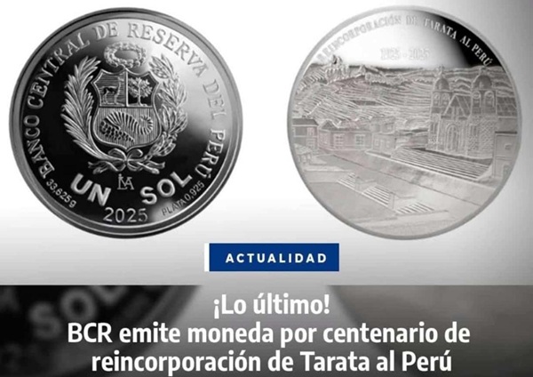 En el marco del centenario de la reincorporación de la provincia de Tarata al territorio nacional, el Banco Central de Reserva del Perú (BCRP) anunció la emisión oficial de una moneda conmemorativa de plata, gestionada también con el respaldo del Gobierno Regional de Tacna.