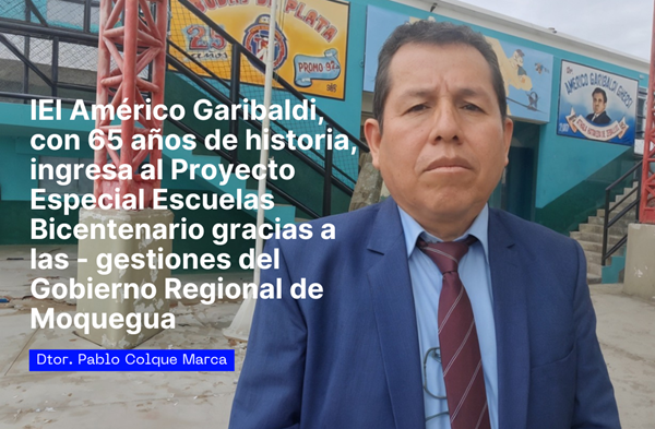 El director de la Institución Educativa Inicial Américo Garibaldi Ghersi, Pablo Colque Marca, expresó su reconocimiento al Gobierno Regional de Moquegua y, en particular, a la gobernadora Gilia Gutiérrez Ayala, por las gestiones que permitieron la incorporación de su plantel al Proyecto Especial de Inversión Pública Escuelas Bicentenario (PEIP EB).