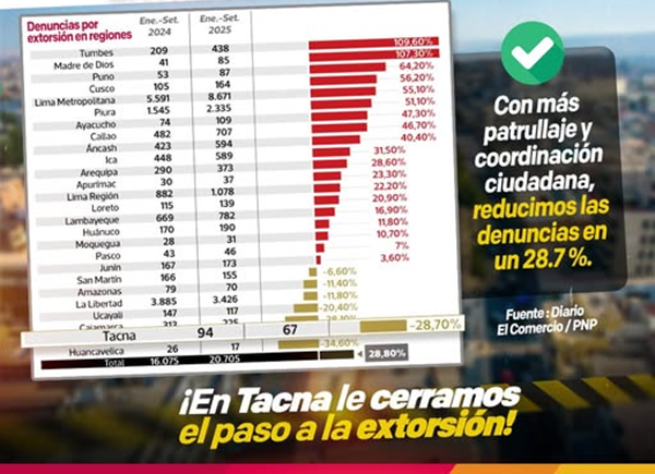 De acuerdo con el Sistema de Denuncias Policiales (Sidpol), entre enero y setiembre del 2025 la extorsión se ha convertido en uno de los delitos de mayor crecimiento a nivel nacional. Sin embargo, en nuestra región logramos reducir las denuncias en un 28.7 %, ubicándonos como la segunda región con mayor disminución en el país.