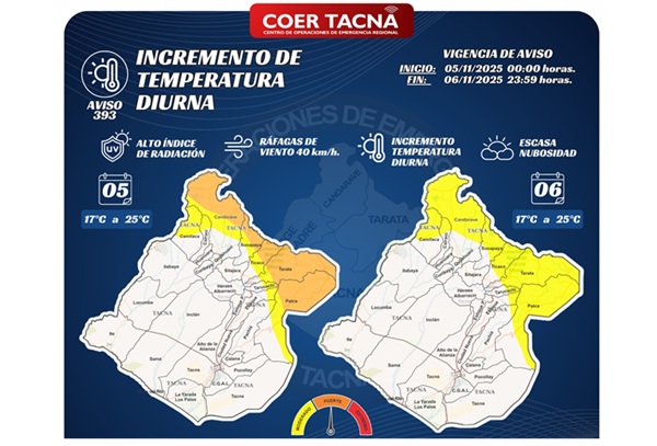 SENAMHI informa que, los días 05 y 06 de noviembre se registrará un incremento de la temperatura diurna, con valores que oscilarán entre 17 °C y 25 °C, presentando una intensidad de fuerte a ligera según la zona.