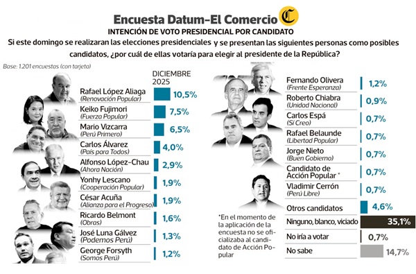 Entre los 37 candidatos que aspiran a llegar a Palacio de Gobierno en 2026 —dos agrupaciones no presentaron fórmulas presidenciales—, apenas el 8% de la ciudadanía considera que existen “muy buenas opciones”, mientras que un 37% cree que hay “algunas buenas” alternativas en las fórmulas. El estudio efectuado a escala nacional se realizó entre el 4 y el 8 de diciembre; es decir, una vez concluido el proceso de elecciones primarias.