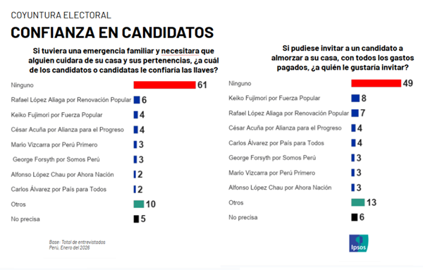 Tal es el escepticismo de los peruanos hacia los aspirantes presidenciales que el 61% confirma que no le confiaría las llaves de su casa a ninguno si tuviese una emergencia familiar y necesitara que cuidaran su casa y sus pertenencias.